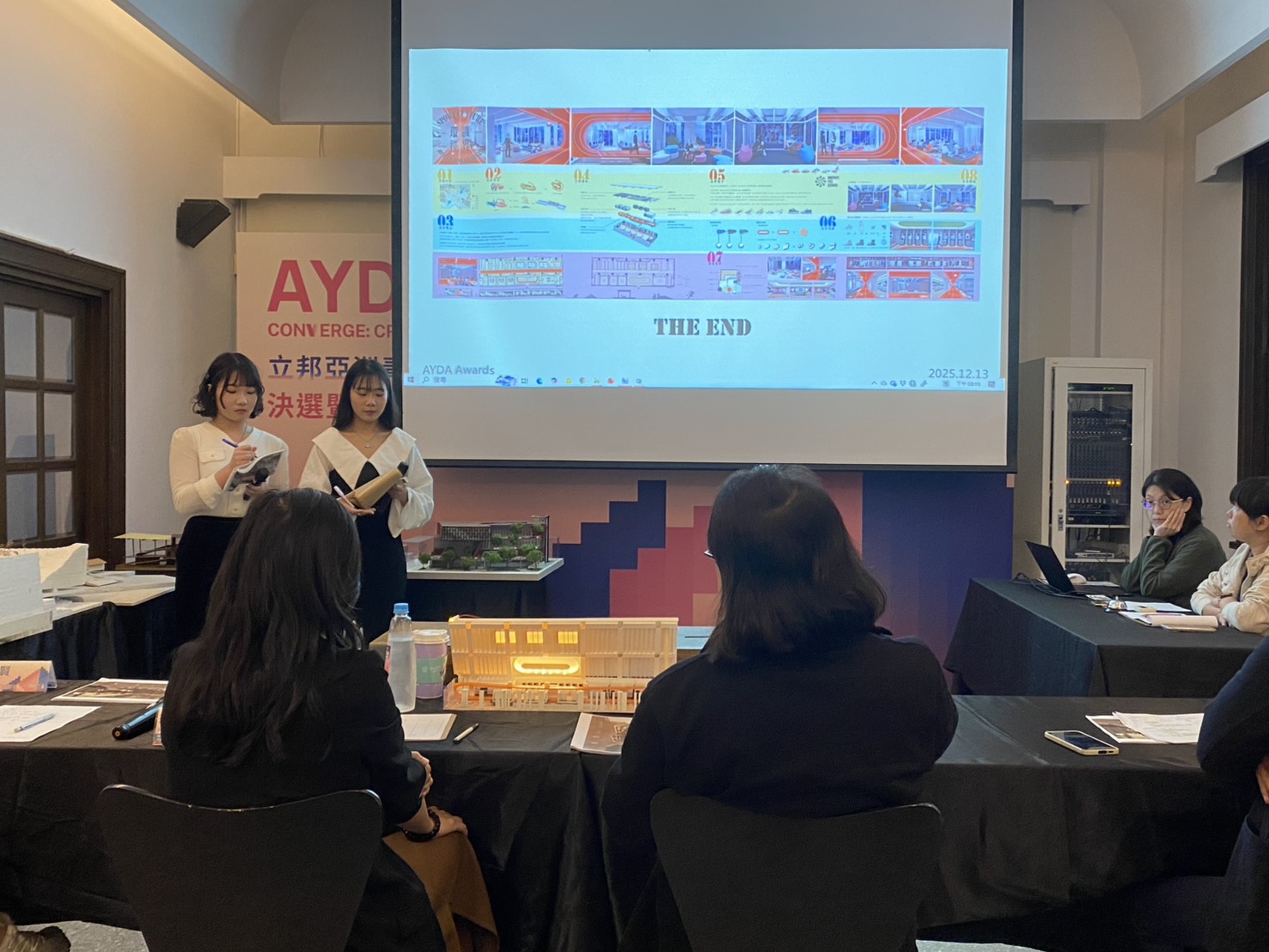 恭喜本系大三學生劉芷安與陳誼庭同學,榮獲立邦2025AYDA AWARDS設計競圖大賽的銀獎賞,隨之也將代表台灣參與國外的白金競賽 ,著實令所有大三教學老師團欣慰。今年我們是以「運動文化、健康永續」為議題進行發展,內容強調跨時間、跨區域、 跨語言、跨性別、跨種族、跨國度的特性,將文化、永續、品牌、商辦空間與創意設計等揉和為一體, 激發對文化議題的特殊呈現,加上兩位初生之犢不怕虎的同學們精彩雙簧發表下、深獲在場評審委員以及主辦單位的讚賞。芷安與誼庭同學在僅只有五個星期的時限當中,經過不斷地來回的討論與修正、以及附加一個星期不停的排練和簡報修正之下,終於將最美好的一面展現給大家,並以大三學生之姿匹敵其他高年級和碩士班學生,為自身與本系爭光,著實值得嘉許讚賞。在此感謝王菱檥老師的協助指導,以及大三教學團隊的配合,讓孩子們可以在成長中擦亮中原品牌。歡迎大家踴躍鼓勵孩子們加入中原大學室內設計學系。